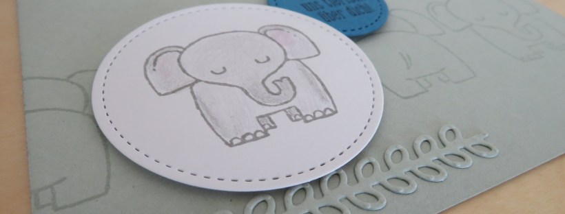 Für die heutige Karte habe ich den Elefanten aus dem Set gewählt. Die Zweige im Hintergrund sind mit den passenden Framelits „Tierisch süß“ ausgestanzt. Dem Elefanten, der auf dem Stickmusterkreis drohnt, habe ich kurzerhand mit der Schere das Hinterteil abgeschnitten. So können die Stempel auch einzeln benutzt werden. Für die graue Färbung habe ich einen weichen Bleistift verwendet.
