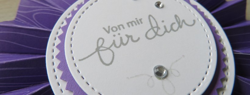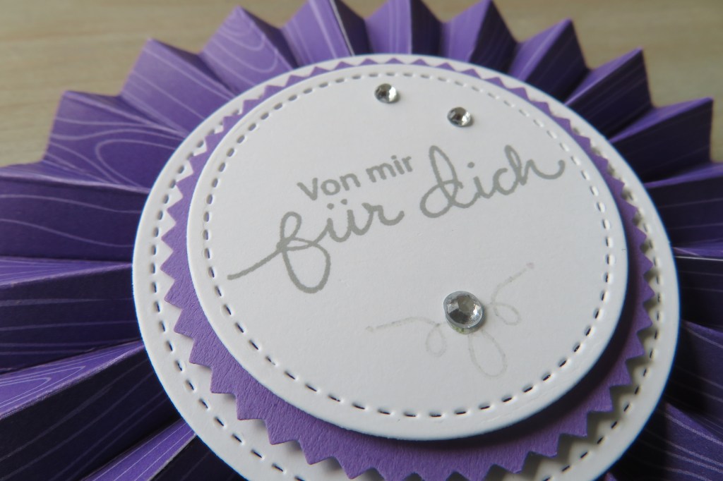 Heute möchte ich euch meine selbst hergestellte Rosette zeigen. Die Rosetten sind vielseitig einsetzbar, sei es als Geschenkaufleger, mit Stab als Deko oder zum Aufhängen.