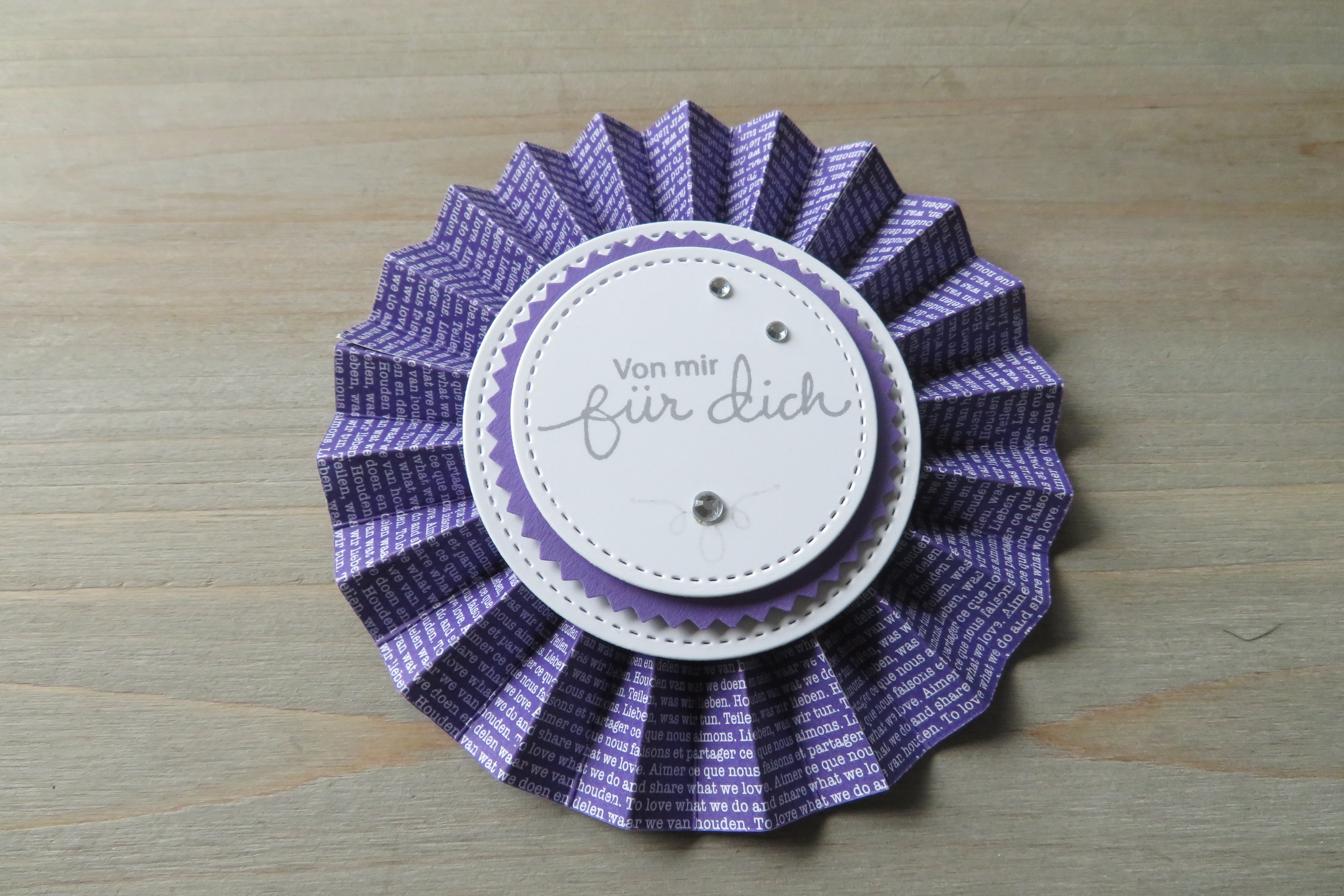 Verwendet habe ich ein 15cm x 15cm großes Papier, dieses wird an einer Seite im Abstand von 1cm Schritten durchgefalzt. Dann das Papier von der zweiten Seiten in 5cm große Streifen geschnitten, sodass 2 gleichgroße Streifen mit der gleichen Falzung herauskommen. Dann alle drei Streifen hintereinander zu einer „Rolle“ zusammenkleben und am Ende, am Besten mit Heißkleber, die Dekokreise aufkleben.