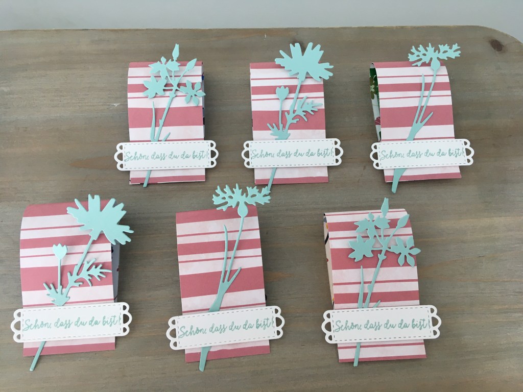 Heute zeige ich euch ein kleines Tischgoodie, dass ich für ein einen Grillabend vorbereitet habe. Dafür habe ich ein Stück Designerpapier zugeschnitten (19x5cm), etwas süßes eingeklebt und an den Enden zusammen getackert. Dekoriert habe ich alles mit den Stanzformen „Wiese“.