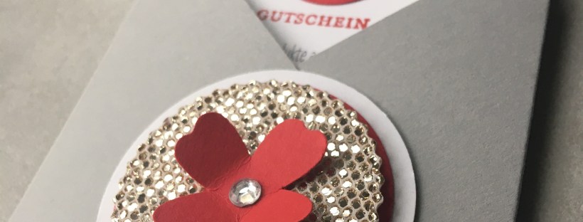 Anbei seht ihr ein Beispiel für einen Gutschein, den der Beschenkte dann bei mir einlösen kann. Der Betrag ist natürlich frei wählbar. Zum Einsatz kam u.a. die „Blüten und Blätter“ Stanze, sowie das Glitzerpapier aus der aktuellen Sale-a-bration Aktion.