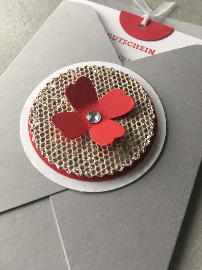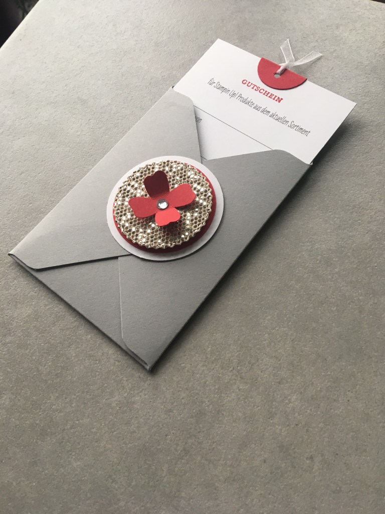 Anbei seht ihr ein Beispiel für einen Gutschein, den der Beschenkte dann bei mir einlösen kann. Der Betrag ist natürlich frei wählbar. Zum Einsatz kam u.a. die „Blüten und Blätter“ Stanze, sowie das Glitzerpapier aus der aktuellen Sale-a-bration Aktion.