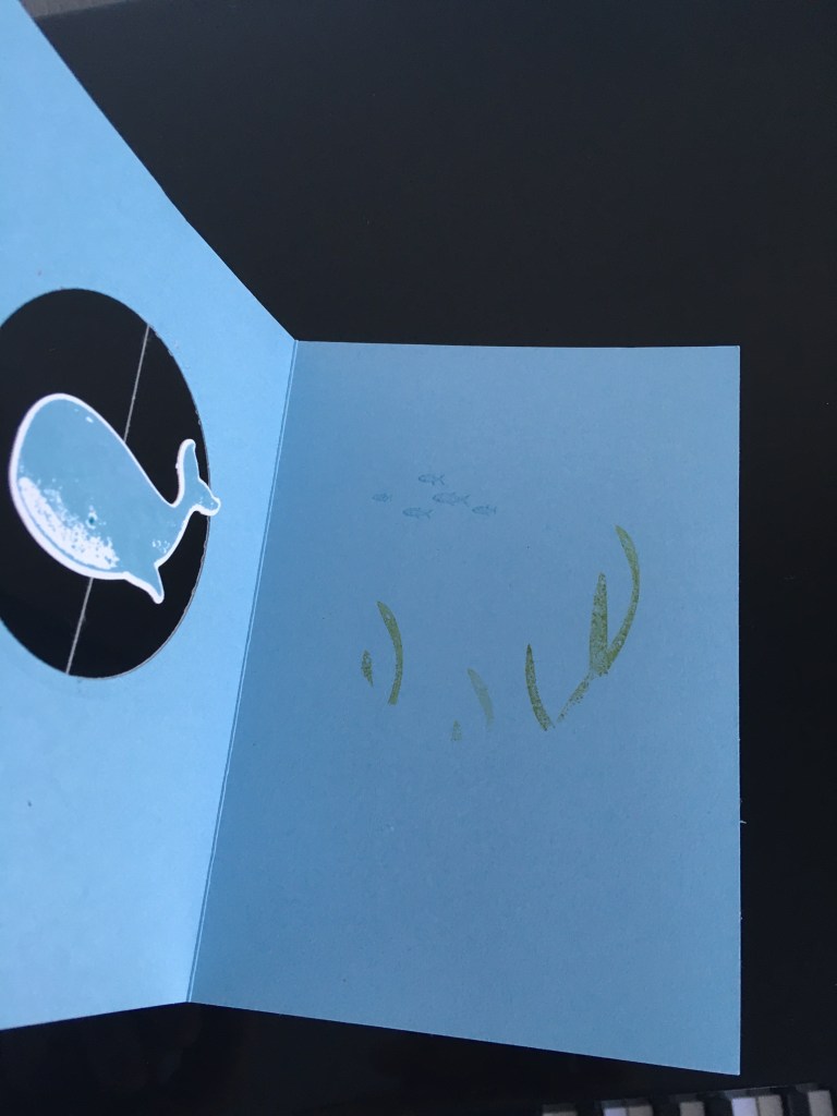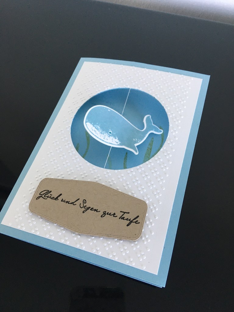 Glückwünsche zur Taufe mal nicht 0-8-15, sondern mit einem süßen Wal. Durch das “Loch“ auf der Vorderseite der Karte, kann der Wal aus dem Set „Fantasfisch“ sogar etwas schwimmen 😊. Nur den Platz Innen zum Schreiben muss, neben dem Meereshintergrund, gut eingeteilt werden.